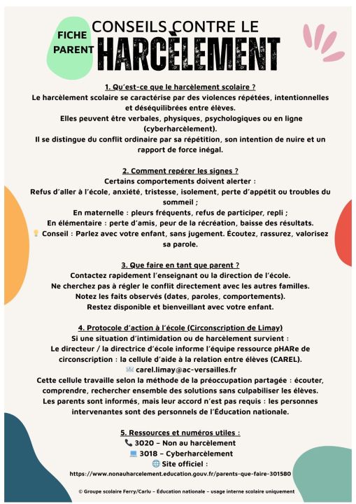 Le groupe scolaire Ferry/Carlu a organisé, le mardi 4 novembre 2025, un Café des parents consacré au thème du harcèlement scolaire.