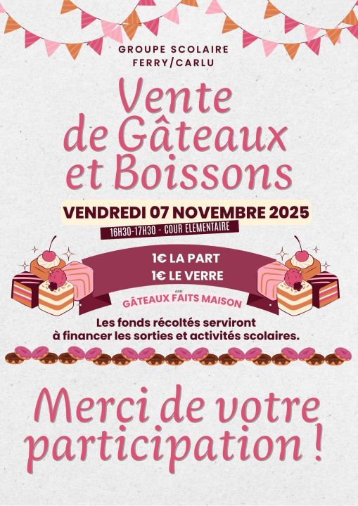 Nous avons le plaisir de vous informer qu’une vente de gâteaux et de boissons aura lieu le vendredi 07 novembre à la sortie de l’école.